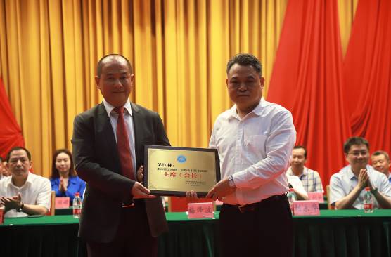 (區(qū)委常委、統(tǒng)戰(zhàn)部部長梅澤波為新一屆主席(會長)吳江林授牌)